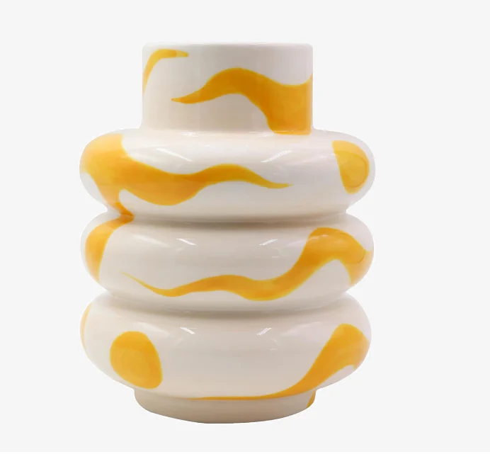 Organik formu ve sıcak sarı rengiyle el yapımı bu vazo, her iç mekânda dikkat çekici bir parçadır.